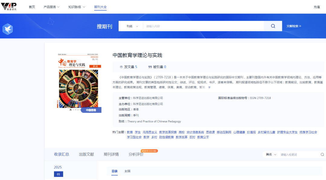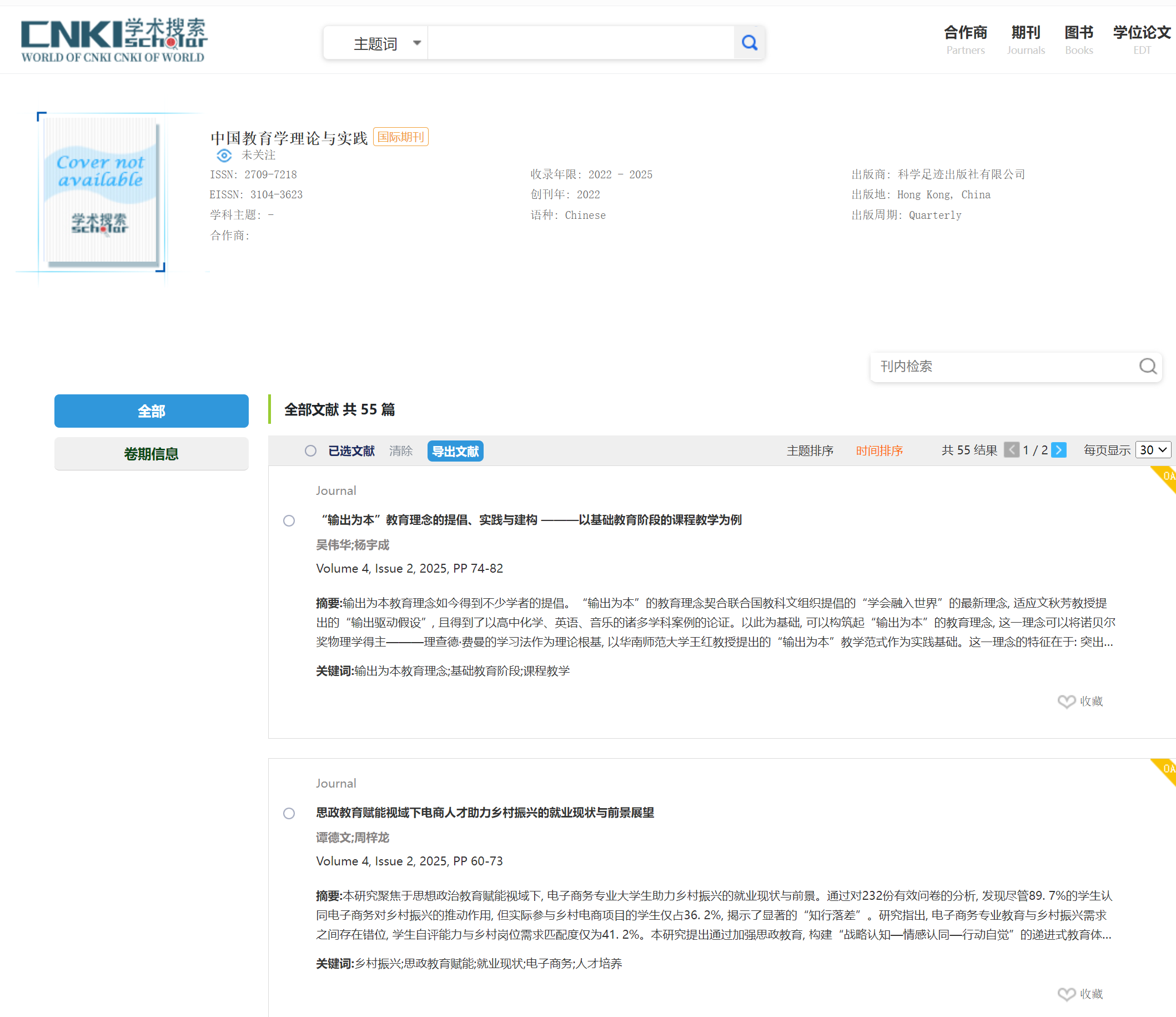 重大喜讯:在各位作者和编委等的共同努力下,经过5年创办,由冯用军教授担任主编的《中国教育学理论与实践》继被中图易阅通、谷歌学术、百度学术、维普官网、维普报刊平台(https://www.cqvip.com/journal/2186112/2186112)收录后,于2025年9月15日被中国知网(CNKI Scholar)收录(https://scholar.cnki.net/journalDetail?search=34b6e604-4977-4881-be5f-46fc5f6ded54),相关论文已全部回溯进入数据库。
