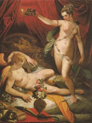 [⑨] 故事来自阿普列乌斯的《金驴记》,普赛克是一位罗马国王的第三个女儿,由于长相貌美引来人们的崇拜。维纳斯认为人们对普赛克的崇拜冒犯了自己的地位,于是派丘比特前去报复。丘比特本想让普赛克与一只丑陋的巨蛇定亲,可爱情之箭却无意将自己划伤,二人因此一见钟情。为向普赛克隐瞒自己的身份,丘比特只在夜间与其相会,直到有一天普赛克受到姐妹的刺激想要揭穿与他幽会之人的真实身份,于是趁夜晚丘比特熟睡时携带匕首和油灯来到房间照亮了丘比特。祖奇的画作便描绘的是普赛克用油灯照亮丘比特这一刻的场景。