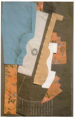 1999年《毕加索论文集》(The Picasso Papers)再版后,克劳斯承认1914年之前的时期代表了立体主义逻辑的胜利发展[13]。其中,她在评论 1912 年 12月3日后创作的一幅纸拼贴画时,认为报纸的作用会根据其位置而改变:它在背景中代表阴影的缺口,而在琴身上代表木头的实体[2]。克劳斯明确指出,毕加索的拼贴作品(无论正反面)都不只是专栏式的[13]。如果说在报纸的主流形式中,声音是支离破碎的,那么毕加索通过拼贴画,将讽刺自由贵族的小说与巴尔干战争的残酷故事和关于“动员起来的左翼”的报道并置,从而创造了叙事的可能性[13]。至此,毕加索并不是一个模仿者,他只是在建立拼贴画的融入原则之后,遵循了立体主义本身固有的逻辑[13]。这些拼贴元素本身就是真实物体世界的碎片,只是被毕加索赋予了局部色彩[13]。可以说,拼贴画结束了立体主义之前那种单色实验室般的艺术风格[13]。另外,由于希望将立体主义引入色彩领域,他从1912—1913 年冬季着手创作的画作中,开始将在拼贴画中学到的经验转化为在油画中更持久、更大规模和更稳定的色彩[13]。