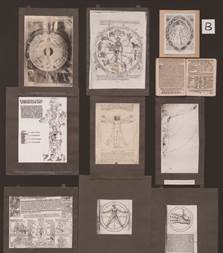 与斯洛特戴克相似,瓦尔堡对“几何学”的理解同样具有深刻的本体论意味。在《记忆女神图集》的图板B中(图2),瓦尔堡探讨了人类与宇宙之间关系系统的历史性演变:古代“预定和谐”(praestabilierte Harmonie)的观念,在近代被重新阐释为一种抽象化、世俗化的“几何学”形式。图板B的导语清晰地描述了这一过程:“人类运用宇宙系统的不同层级。和谐的联系。近晚对和谐的损减,将之简化为了抽象的而非依据于宇宙的几何学(列奥纳多Iionardo)。”[7]在这块图板上,瓦尔堡将古代手稿中的“黄道人体”(homo signorum)与文艺复兴时期阿格里帕、丟勒和达·芬奇的人体比例研究并置在一起,展示了人与宇宙之间的交感式的、存在论意义上的关系模式如何在几何学的理性模式中被精细化和抽象化。