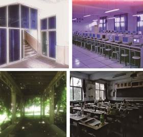 首先,中式梦核图像的主题是具有本土属性的阈限性对象,它们植根于现实场景,却拥有坍缩为超现实梦境的潜能。如果说欧美梦核图像着眼于卧室、楼道、废弃游乐场等阈限空间的诡异氛围,那么中式梦核图像则进一步加入了大量保存着人类活动痕迹的阈限性物品,如老式居民楼的蓝色玻璃,工薪家庭房间里的木质装潢,一尘不染的微机教室,中小学的书本和桌椅等(见图3)。除了物理空间外,还有部分数字赛博空间及虚拟物品也同样成为表现对象,包括门户网站主页、QQ宠物、游戏道具、博客论坛图标等。不论是物理实体还是虚拟空间,都不同程度地留存着私人或公共记忆,但这些阈限性对象毫无“原貌”而只存“遗迹”,其现实属性所唤起的记忆总是在涌现的片刻旋即消失——正如蓝色玻璃与木质卧室,本就是世纪之交中国社会快速转型期短暂风行的一种环境设计,它的快速衰落不但是隐喻地、并且是实在地言说着社会上行、经济膨胀伴生的价值虚妄。而伴随着HTML网址的消失和页面内文字图像的不可访问,关于网站和平台的记忆也处在持续衰朽(decaying)的状态,成为一类仅存遗迹的“死媒介”。[11]因此,表现阈限空间的图像始终介于熟悉和未知地带,构造出非此非彼的情境,或者说步入一个“旧世界已被抛诸身后,新世界却尚未知晓”的界域。[12]这无疑凸显着图像主题同主体经验间发生的断裂。