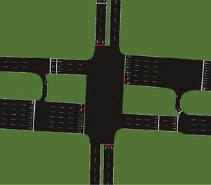 在本研究中,构建了华穗路与花城大道交叉口的仿真路网文件,如图1所示。该交叉口南北方向进口道各设有1条直左合用车道和1条直右合用车道;东进口道设置有1条右转车道、3条直行车道、1条左转车道及1条左转-掉头混合车道;西进口道设置有1条右转车道、3条直行车道和2条左转车道。