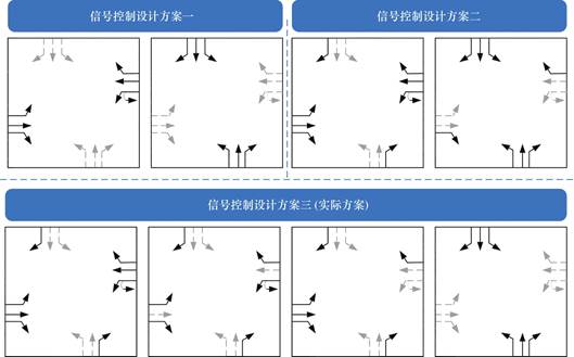 Fig.2 Timed signal control schemes for the intersection(The two signal control schemes at the top are the designs proposed in this study,both with two phases;the scheme at the bottom is the real-world operational scheme,which consists of four phases)