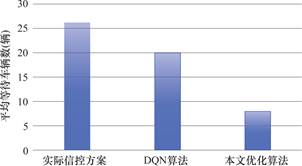 图4显示了该交叉口分别在现实情况下、DQN算法和结合专家经验的DQN优化算法这3种信号控制算法下的平均等待车辆数量,分别为26、20和8辆。结果显示,相较于现实信控方案,DQN算法将平均等待车辆数量降低了23.1%;而结合专家经验的DQN优化算法将其降低了69.2%。这一结果表明,结合专家经验知识的DQN信控优化算法显著减少了交叉口的等待车辆数量。