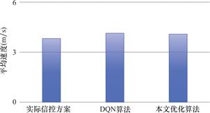 图5显示了该交叉口3种信号控制算法下的平均速度。与现实信号控制方案相比,DQN算法和结合专家经验的DQN优化算法均将交叉口平均速度提高了7.9%。这一结果表明,应用这两种优化算法都能够有效提升交叉口的通行效率,减少交通延误。