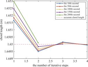 Fig.3 illustrates the variation of the iterative chord length at different moments under the constant iterative parameter 0.15.It can be observed that at 10 s,50 s,100 s,150 s,and 200 s,the number of iterative steps is 4,4,3,3 and 2,respectively.The trend of chord length variation exhibits good consistency.
