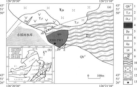 1.第四系;2.下侏罗统;3.上石炭统;4.头道沟岩组;5矽卡岩;6.大理岩;7.钎长角闪片岩;8.早J1花岗斑岩;9.早J1花岗岩组合;10.中二叠世角闪石岩;11.中二叠世辉绿岩;12.超镁铁质岩;13.断层;14.样品位置
