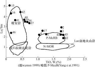 歪头3个流纹岩(40、41、42)高SiO2,为73.10%-75.56%;富Na2O,含量3.87%-4.70%,应为石英角斑岩;3个富镁安山岩(37、38、39)的MgO含量9.22%-9.49%,Mg#为49-53;SiO2分别为54.12%-54.50%,为玻安岩或高镁安山岩。在图TiO2-(La/Sm)N(图3-4)上投点极近玻安岩区。富强流纹岩(46):SiO2为78.93%,Na2O含量3.75%,TiO2%特低,含量0.15%,TiO2-(La/Sm)N(图3-4)上落入玻安岩区。