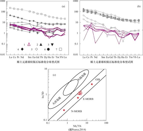 3个辉石橄榄辉石岩的稀土元素:总量∑REE=4.90~17.79,平均12.49;LREE/HREE=1.13-5.47,平均3.41;δEu=0.28-2.8,平均1.31,弱正异常,球粒陨石标准化配分图呈缓右倾模式(图3-4,c),(La/Sm)N,分别为0.44、2.65、1.17,平均大于1,具有P-M0RB特点,显示形成于弧前环境[25]。