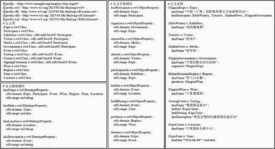知识抽取与表示主要基于w3软件(http://www.w3.org),在线创建第四届中国(宁夏)国际葡萄酒文化旅游博览会时空过程知识图谱库“CIWCTE/2025/01”(图3),通过该软件自带的实体识别、关系抽取等功能,从CIWCTE活动新闻数据库文本中提取关键信息,如“葡萄种植”是“苗圃技术”,“局域小气候和特殊生境形成的微生物群落”是“葡萄酒发酵催化的关键密码”,“风土要素”是“风味养成的客观必要条件”等。知识表示则采用图结构,以节点(实体)和边(关系)的形式存储和展示。利用语义嵌入(Word2Vec)和图神经网络(GNN),实现CIWCTE时空过程的语义增强与推理。例如,通过分析“贺兰山东麓葡萄酒产区” “百年葡萄老藤”“鸽子山遗址”“贺兰山岩画”与“贺兰山东麓国际旅游度假区”的关系,自动生成“独特性的区域生态系统提供的综合性服务功能与地域文化是旅游地从景点、景区集成发展为旅游综合体、旅游度假区、旅游目的地的核心构件和驱动力”等更深度的知识内容。