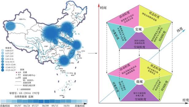 图8 第4届CIWCTE活动空间分布核密度估计与多粒度时空过程切片(作者自绘)注:该图基于中国标准地图服务系统(http://bzdt.ch.mnr.gov.cn/)下载的审图号为宁GS(2016)第1592号的标准地图制作,底图无修改。