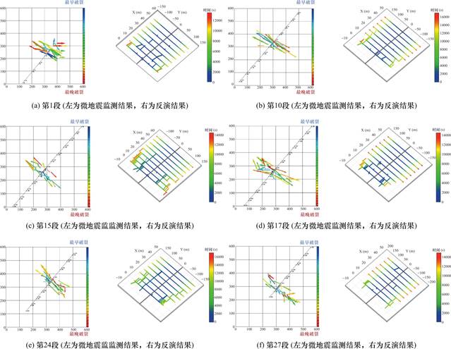 (3)开展H井的现场数据的反演工作。通过反演结果与实测压力数据及微震监测结果的对比表明:反演得到的压力曲线与实测值吻合度较高;反演与微震监测的水力裂缝长度相对误差小于20%;二者的缝网扩展的时空分布基本一致,而且破坏形式也呈现出相似的特征。