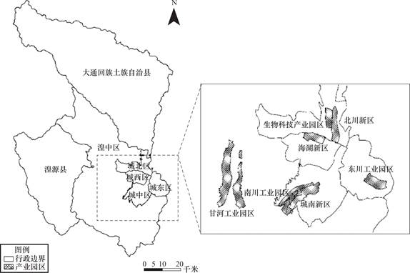 从2000年开始在由城中区、城东区、城西区、城北区和湟中县(区)五个市辖区所组成的中心城市地域内,西宁市陆续设置了西宁(国家级)经济技术开发区,高新技术产业开发区(生物科技产业园区,位于城北区)、城南新区、海湖新区、川北新区等城市新功能区。其中,西宁(国家级)经济技术开发区实行一区多元的管理模式,包括位于城东区的东川工业园区、位于湟中县的甘河工业园区和位于城中区的南川工业园区三个产业园区(见图1)。在产业园区和城市新区开发建设的带动下,西宁市无论是经济和人口增长,还是建成区的扩展都进入高速状态,为我们观察和研究产业园区推动下的人口规模扩张和城市环境变化提供了一个极佳的样本。
