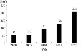 产业园区及依托产业园区的新城建设推动西宁市城区急速扩张,建成区面积由2000年初的52km2扩展到2010年的91km2,到2020年已经达到208km2(见图5),过去10年增加了108%。而在20世纪整个90年代西宁市建成区面积仅增加了2km2。建成区的扩张过程由两种方式实现,一是产业园区建设本身推动的建成区扩展。西宁市最早设立的东川产业园区,规划面积12.79km2,生物科技产业园最初规划建设面积10km2,甘河工业园区规划面积10.89km2,南川产业园区规划面积约10km2。到2010年前后,除东川产业园区由于地形限制之外,其他三个产业园区都分别进行扩容,生物技术产业园区扩容面积23.5km2,南川更达到了31.39km2,甘河工业园区达到35.28km2。园区规划面积由最初的53.78km2增加到101.06km2。