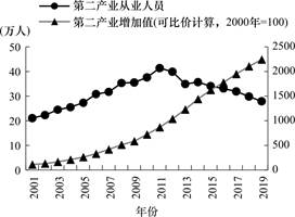 Fig.7 Changes of added value and employees of the secondary industry in Xining City
