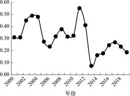 图9 2000—2020年西宁市城镇眷带系数的变化