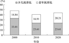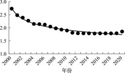 西宁市人口眷带系数经历了一个先将后升的趋势,从21世纪初期接近2.5一直下降到2008年的2.0左右,此后又进一步下降到2016年的最低点,从2016年开始近五年又逐步上升,形成一个“U”字形的走势(见图9)。这一变化趋势有着牢固现实含义,受到人口年龄结构变化的调控。由表4所示,西宁市2000年的人口总抚养比是45.97,此后下滑到2010年的38.92,下滑的主要原因由于人口出生率下降导致是少儿抚养比大幅下降,2020年人口总抚养比又回升到44.33左右,回升的主要原因是受人口老龄化影响,在幼儿抚养比保持基本稳定的同时老年抚养比大幅上升(图10)。人口结构演变成为眷带系数变化的根源。西宁市的变化表明,随着我国计划生育政策的调整,在人口出生率和少儿抚养比保持稳定,而老龄化趋势加重会带动带眷系数的上升,这将是判断未来我国城市规模变化的一个重要因素。