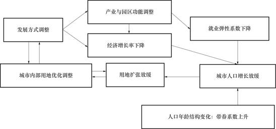 经济增长方式由粗放式向高质量转变的过程中,经济增长率的下降,产业与产业园区功能调整,带来劳动生产率的提高,就业弹性系数下降是长期趋势。伴随经济发展水平的提高,人口出生率下降及老龄化加深也是社会发展的长期趋势之一,从而带动劳动带眷系数的呈先下降后上升之势。带眷系数与就业弹性系数双重叠加影响,与粗放式发展时期相比城市人口增长速度将放缓,用地扩张速度也因此而放缓,城市空间进入内部优化调整期。这一过程可以用图11来表达。