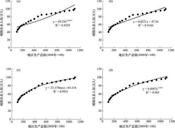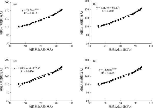根据前面经济增长与就业扩张过程,以及就业弹性系数和带眷系数的变化过程的分析,来模拟经济增长与就业扩张,就业扩张与城镇人口规模变化之间的数量关系。首先,对于西宁市经济增长对劳动力吸纳之间的关系采用最常用的过指数模型、线性模型、对数模型和幂指数模型分别进行拟合(见图9),四个模型的R2分别为0.846、0.9106、0.9951和0.9876,都达到了很高的程度,但相比而言对数模型的R2最大,拟合程度最优。这一方面印证了经济增长与就业吸纳存在的紧密关系,另一方面也表明随着发展水平的提高,单位经济增长带来的就业增量在下降,即经济增长的就业弹性系数在经济发展的后期阶段会下降,对数模型与这一客观趋势相吻合。