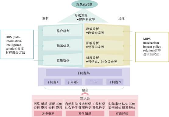 DIIS(data-information-intelligence-solution)和MIPS(mechanism-impact-policy-solution)从过程融合和逻辑层次的循环迭代为智库现代化研究范式提供了新方向。智库DIIS理论方法,即智库过程融合法,从智库问题解决的环节角度,将智库研究分解为数据收集、信息挖掘、论证分析和决策方案形成四个规范性环节[16]。在现代化研究过程中主要表现为:针对现代化进程的现实问题,广泛采集各类关联数据,运用专业手段深入挖掘、细致梳理并精准剖析数据,提炼有价值信息,制定切实可行的解决方案或者具有前瞻性、针对性的政策建议,为现代化建设中的难题破解提供智力支持与决策参考。MIPS理论方法,即智库逻辑层次法,也就是要从机理分析出发,验证不同场景下的政策影响,并进行深入分析,最终提出解决方案,也就是对某一事物的智库研究进行规律性的认知探索,并运用这一规律形成具体应用政策和解决方案。在智库现代化研究中,首先进行现代化的机理分析,就是将复杂的现代化现象分解形成各个子问题集,并运用科学的方法进行数据分析论证,探索现代化的发展规律;其次将现代化推进过程中各要素之间的相互影响关系进行梳理,这种影响分析不仅包括领域内部的影响分析,还包括与其他相关领域的影响分析,比如农业现代化的研究不仅要进行农业技术、农业管理、农业组织方式对农业现代化的影响分析,还要进行农业环境、人口规模、经济发展等外部因素的影响分析等等;其次评估现代化政策实施可能产生的效果,预测不同场景不同变量作用下形成的政策效果;最后提出具有科学性、前瞻性和可操作性的解决方案或措施建议。