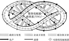 因此,要发展以科技创新为核心的新质生产力,离不开消费端在水平、结构和业态方面的转型升级,发挥需求侧对供给侧的牵引和反馈作用。重点在于建立生产端与消费端的良性循环,使ESG(环境、社会和治理)和碳普惠在内的理念、技术、知识、资本等要素资源顺畅流通和整合。本研究构建了数智平台治理赋能新质生产-消费力协同发展模型(图1)。