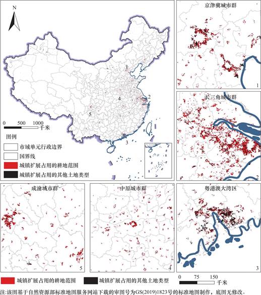 城镇用地是人口密集、社会经济活动集中的核心区域,同时是人类对自然环境影响最显著的空间。城镇化过程中,城镇用地的扩展被视为其空间表现最显著特征之一[1],并且是联合国可持续发展目标11(SDG11,可持续城市和社区)的重要关注区域[2,3]。随着社会经济的快速发展和人口的持续增长,全球城镇化进程加速,导致大规模农田被占用,城镇用地扩张与耕地保护之间的矛盾日益加剧,难以调和,进而对实现SDG 2(零饥饿目标)构成威胁[4,5]。中国目前正在经历快速城镇化过程,城镇用地扩展作为城镇化最直接的体现,正深刻影响中国的土地利用系统。遥感监测结果显示,在1980年至2015年期间,中国耕地面积出现了一定程度的缩减,城乡工矿以及居民用地空间不断向外拓展形成对耕地的占用是重要原因。并且,以时间发展为脉络来看,耕地流失到城镇用地的比例逐渐增加[6,7]。城镇用地扩展对耕地面积的侵占不仅会影响耕地的可持续化发展[4],同时也会加剧中国粮食安全的压力[8]。研究城镇用地扩展对耕地占用的时空特征对于土地可持续利用具有重要价值。