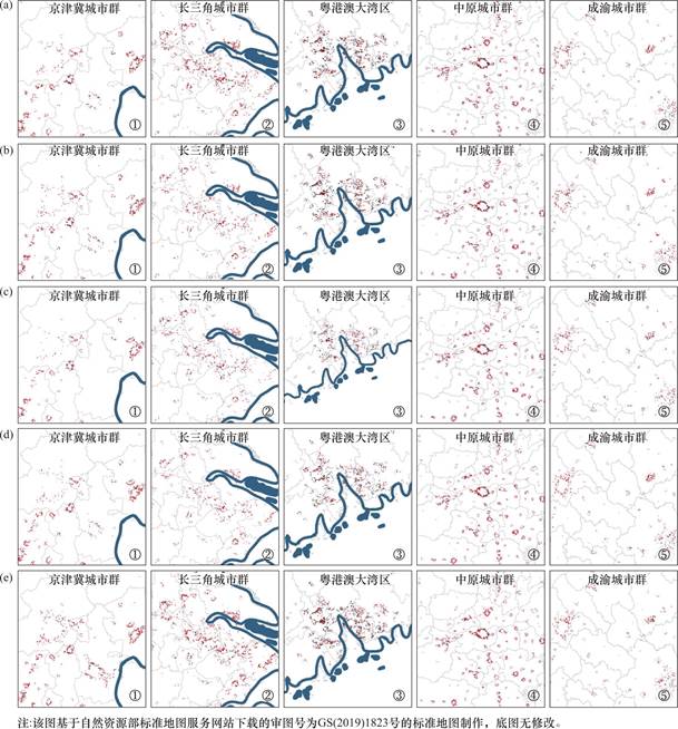 图3 5种SSP情景下2015—2030年未来中国城镇用地占用耕地空间分布概况(自制)(a)SSP1;(b)SSP2;(c)SSP3;(d)SSP4;(e)SSP5