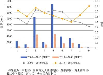 与前一个15年相比,2015年之后的15年间城镇占用耕地的面积预计将大幅减少。各农业区内,城镇扩展对耕地的影响普遍显著降低(图5)。其中,长江中下游区的耕地占用面积减少最大(UEC减少10316km2),而降幅最大的是东北区,达到76.33%。尽管如此,在UEC和CR方面,长江中下游区和黄淮海区仍然位居所有农业区的前列(表2、图5),这表明,未来阶段黄淮海区的城镇扩展对耕地的侵占依然较大。考虑到这两个区域是我国重要的粮食主产区,值得引起高度关注。