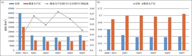 本文基于SSPs下中国城镇用地预测结果的数据集和耕地数据,分别从全国层面与粮食主产区这两个尺度,针对城镇用地扩展给耕地面积带来影响的时空特性及未来走向展开分析,研究发现: