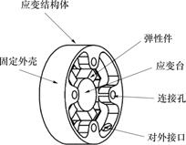 组合式传感器弹性体结构是指由多个独立的弹性体元件组成的结构,每个弹性体元件可以独立地感应到力值信息。组合式弹性体采用分开加工再组装的方式来完成,由于它的弹性体部分是可以拆卸的,所以零部件的加工更具有灵活性,并且还能够产生更多样的结构形式。南京航空航天大学沈辉等[14]设计了组合式二维力/扭矩传感器,一板两杆式结构用于测量扭矩,双连孔结构用于测量轴向力,能测量量程为 2Nm的扭矩和200N的法向力,分辨力分别为0.002Nm和0.2N。可应用于测试超声电机在工作时定子、转子摩擦力/力矩。上海尚测科技有限公司朱成平等[15]设计了一种组合式力/扭矩传感器,如图3所示,这种组合式力/扭矩传感器设计简洁,易于使用,并且可以根据不同的应用环境有效转化为压力传感器、扭矩传感器或压扭二维力传感器以满足各种需求。