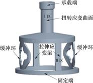 整体式弹性体结构是由整块材料经去除材料加工而成的,该类弹性体具有综合性能高、无需装配及无摩擦间隙等优点[16]。蚌埠学院罗少轩等[17]设计了用于高速旋转设备的磁耦合旋转复合力传感器,如图4 所示,在扭转应变区安装应变片,形成惠斯通电桥用于扭矩测量;在拉应变区安装应变片,形成惠斯通电桥用于拉力测量。该传感器能够准确检测设备高速旋转时末端执行器的扭转和拉力,传感器综合测量精度≤0.5%F.S。重庆大学唐亮等[18]研制了一种高拉扭载荷比复合式传感器,如图5所示,该传感器具有拉扭耦合小、重复性好等优点。中航电测仪器股份有限公司石荣武等[19]研制出一种用于纵横向操纵力测量的轴扭二分力传感器,经过测试,直线度为0.29% F·S,交叉干扰为1.92% F·S,准确度为1.92% F·S。表明该传感器能够测量驾驶员操纵力,以便指导驾驶员调节纵横向操纵力。