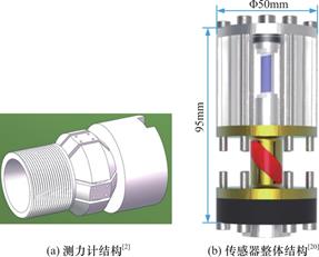 高强度螺栓连接副的扭矩系数是指当拧紧螺母时,使螺栓产生一个单位预紧力所需要的扭矩,是确定螺栓预紧力的关键因素之一。若预紧力过高,高强度螺栓可能会出现断裂的风险;反之,若预紧力过低,高强度螺栓在进行连接时强度将会降低。福建省计量科学研究院王秀荣[21]提出了一种基于电阻应变式原理的轴扭二维力传感器,如图7(a)所示,传感器弹性体由圆柱式和十字梁两种结构组合而成,其中圆柱式部分负责测量轴向力,而十字梁结构部分则用于测定扭矩,所设计传感器最大轴向力值为 500kN,最大扭矩为 2000Nm。通过进行测试,结果表明在进行力值测量和扭矩测量时,相互耦合影响较小。福建肯特计量科技有限公司李海根[22,23]提出了一种可同时检测轴向力和扭矩的传感器结构,如图7(b)所示,力值测量范围为50kN至500kN之间,而扭矩测试范围则为100Nm至2kNm,实验结果表明传感器测量重复性较好。