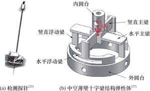 中医针灸手法量化分析是指将传统中医针灸手法转化为科学化的定量参数,并进行系统性的分析和研究,但进行量化研究的前提则是针刺力信息的采集。复旦大学丁光宏等[24,25]研制了一种检测探针,如图8(a)所示,利用应变片和压电陶瓷分别实现扭转力矩和拉压力的测量,结合相应的软硬件系统实现针刺手法扭转力矩和拉压力实时检测。西北工业大学李庆华等[26]研制了一种医用传感针,在两组等截面悬臂梁上粘贴应变片分别测量提插力和捻转扭矩,扭矩测量范围为±4.8×10-2Nm,拉压力测量范围为±1.2N,扭矩和压力测量精度分别为4.0×10-6Nm、1.0×10-2N。东南大学宋爱国等[1,27]设计出基于中空薄壁十字梁结构的应变式二维力传感器,弹性体结构如图8(b)所示,设计了传感器的硬件系统和针刺力测量系统并完成了针刺手法实验,扭矩检测范围为±3Nmm,拉压力检测范围为±3N,实现提插力和捻转力矩实时监测。