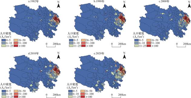 现有研究发现青海省人口城镇化与产业城镇化水平整体都在提升,但存在人口城镇化超前的现象[5],城镇空间分布与发展不均衡,城镇体系等级结构不合理,城乡发展差距大,基本公共服务不平衡等问题[6]。从可持续发展角度来看,青海省一直存在不断增大的生态赤字并导致人口赤字,使得青海省人口与资源、环境之间的矛盾加剧,出现了不可持续发展状态[7],且经济发展和人口转移的动力不足[8]。人口分布和人口迁移是城镇化的根本动力,进而是影响城镇分布格局的基础和前提。从人口分布格局演变的角度去分析城镇化发展趋势,才能以人为本构建科学合理的可持续发展模式。但是,目前的研究存在两个问题,一是受采集的数据时段的影响,没有关注到近十年来青海省人口迁移和城镇化的转折性趋势,影响了城镇化走势的判断;二是虽然强调了走可持续城镇化的必要性,但对于如何构建可持续城镇化模式,构建什么样的城镇化模式存在争论[9,10]。本文以保护青藏高原生态环境和促进人民群众民生福祉“双赢”为基础,通过分析1982—2020年近40年间青海省人口分布和城镇化的演变过程、特点,揭示城镇化发展存在的问题,据此提出打造适宜于青海省的可持续城镇化模式对策。