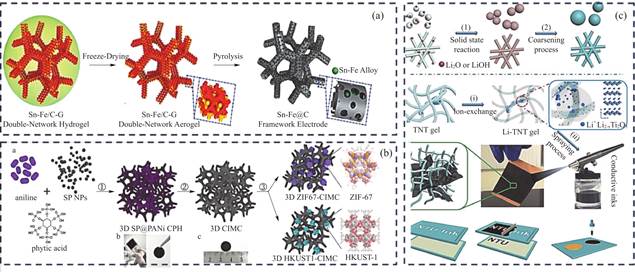图2 水凝胶作为电极材料应用于离子电池的研究(a)三维(3D)氰基无机凝胶桥接Sn(IV)-Fe(II)和壳聚糖-戊二醛有机聚合物电解质的研究[17];(b)LTO/RGO水凝胶网络电极的制备与结构示意图[18];(c)导电聚合物水凝胶集成高性能独立三维(3D)单片电极制备示意图[19]