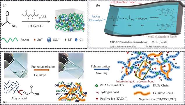 Fig.3 Research on Hydrogels as Electrolyte Materials for Ion battery(a)Preparation mechanism diagram of antifreeze hydrogel[20];(b)Schematic illustration of the preparation process and material structure of chemically synthesized Zn-MnO2 and cross-linked polyacrylamide hydrogel composite electrolyte[21];(c)Schematic diagram of preparation method of sodium polyacrylate(PANa)and cellulose double network hydrogel electrode[22]