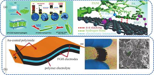 图4 水凝胶材料作为电极材料应用于超级电容器中的研究(a)氧化石墨烯复合聚合物电解质的制备过程及结构[23];(b)功能化石墨烯水凝胶超级电容器的示意图[24]