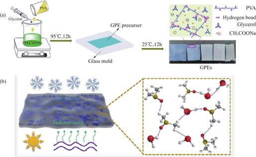 Fig.5 Research on hydrogels as electrolyte materials for supercapacitors(a)Schematic diagram of preparing GPEs using PVA/CH3COONa/glycerol [28];(b)The structure of anti-freezing and thermally stable hydrogel electrolyte [29]