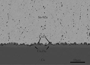 Fig.1 Cross-sectional morphology of the Sn-9Zn/Cu solder joint reflowed for 1min at 240℃