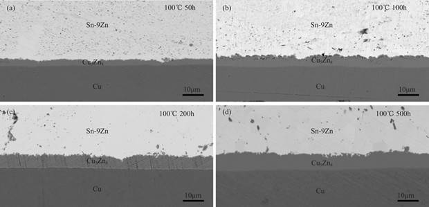 图2 100℃时效老化后的Sn-9Zn/Cu焊点截面形貌(a)50h;(b)100h;(c)200h;(d)500h