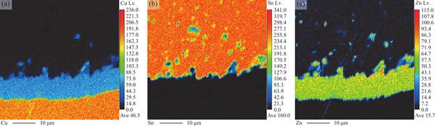 Fig.3 EPMA mapping of the cross-section of the Sn-9Zn/Cu joint after aging at 100℃ for 500h(a)Cu;(b)Sn;(c)Zn