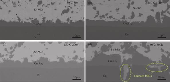 Fig.5 Cross-sectional morphology of Sn-9Zn/Cu solder joints after aging at 150℃ for(a)50h,(b)100h,(c)200h,and(d)500h