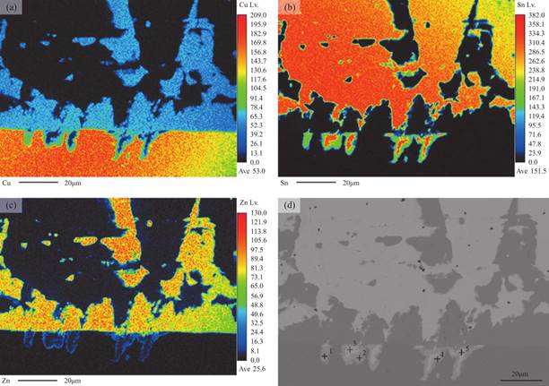 点分析。面分析结果如图6(a-c)所示,从元素分布来看,蚀坑状IMCs处三种元素都存在,Cu主要存在于蚀坑边缘,中央区域极少;Sn在蚀坑中央富集,在边缘处略少;Zn总体较少,且主要分布于蚀坑边缘。而后,结合对图6(d)中各点的定量点分析,结果列于表1,可以判定蚀坑边缘为Cu6(Sn,Zn)5相,中央区域为Sn相,少量的Cu与Zn固溶在Sn基体中。蚀坑中的钎料与Cu基底反应产物并非Cu5Zn8,而是Cu-Sn型IMC,这与钎料中Zn含量的下降有关。具体而言,在点3和点5中,Zn含量分别为1.75at.%和0.93at.%。由于Zn元素主要富集于界面IMC,钎料中的Zn含量下降导致了这一变化。
