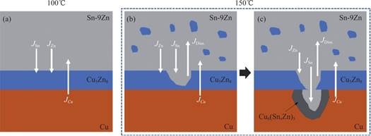 由以上实验结果可以看出,Sn-9Zn/Cu焊点在100℃和150℃条件下时效发生的界面反应现象是不同的。如图7(a)所示,在100℃时,Cu由基板穿过IMC层向钎料中扩散(扩散通量记为JCu,其他元素类同),与钎料中的Zn反应生成层状Cu5Zn8 IMC。随着IMC厚度增加,JCu变小,IMC厚度增量逐渐减小。而在150℃时,Cu5Zn8出现明显的分解,分解后元素向钎料中迁移,记为JDiss.,从而在Cu5Zn8层出现缺口,使Cu5Zn8和钎料的界面相比100℃时更凹凸,如图7(b)所示。由于在150℃时Cu向钎料中的扩散更剧烈,所以更容易在钎料中生成块状Cu5Zn8。随着时效时间延长,部分缺口处的Cu5Zn8被分解完,Cu基板与钎料直接接触而反应,生成Cu6(Sn,Zn)5。而Cu6(Sn,Zn)5也会分解后溶入钎料中,因此在Cu基板中形成蚀坑。随着反应时间继续延长,蚀坑的边界会继续外扩。由于蚀坑中的Sn强度比Cu低,Cu6(Sn,Zn)5为一种本征脆性化合物,呈犬牙状嵌入Cu焊盘,在受力过程中容易成为裂纹的源头,从而削弱焊点的强度。这种不均匀的生长也会造成界面应力不断增大,从而使得焊点的剪切强度下降到只有10MPa[19,20]。对比之下,其他的Sn基主流钎料在同等的时效反应过程中主要生成Cu-Sn系化合物(Cu6Sn5和Cu3Sn),整个过程中不会发生Cu基底的蚀坑效应,但Cu3Sn附近容易生成柯肯达尔孔洞,也会降低焊点的可靠性[21]。