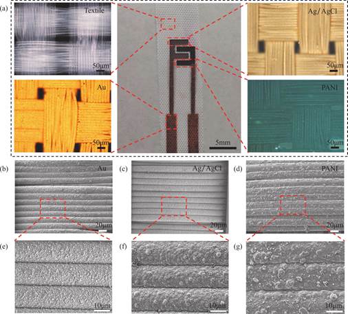 Fig.1 (a)Optical microscope image of fabric pH sensor and its related functional materials;(b)Scanning electron microscope image of gold substrate and its magnification(e);(c)Scanning electron microscope image of silver/ silver chloride and its magnification(f);(d)Scanning electron microscope image of polyaniline and its magnification(g)