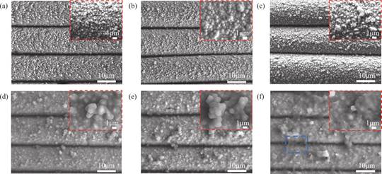 Fig.2 Scanning electron micrographs of polyaniline deposited for different times(a)7min;(b)9min;(c)11min;(d)13min;(e)15min;and(f)17min