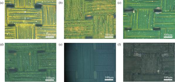 图3 沉积不同时间聚苯胺的光学显微图(a)7min;(b)9min;(c)11min;(d)13min;(e)15min;(f)17min