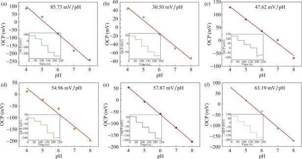 图4 沉积不同时间的聚苯胺pH传感器的线性拟合图(插图为pH响应阶梯图)(a)7min;(b)9min;(c)11min;(d)13min;(e)15min;(f)17min