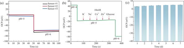 图5 (a)在最优沉积参数下制备的3个pH传感器检测pH=5和6缓冲液的电位响应;(b)沉积15min聚苯胺pH传感器对不同干扰物的电位响应;(c)沉积15min聚苯胺pH传感器连续7天对pH=5的缓冲液的电位响应