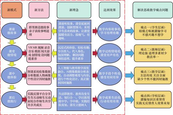 针对“三新”背景的学习与分析,结合新时代国对人才教育的需求,我们更新理念,创新教法,利用“四微”模式,打造新时代的“三新”思政课堂。首先我们根据教材内容,根据学生生活经验,整合创新内容,精心选择合适的小故事视频,课前利用微故事,课前群内推送微故事,或者布置亲子读故事,学生找主题相关的身边故事等形式,将课堂延展到课前,创新预学方式,采用学生喜欢的故事,让课堂温暖有活力,接地气,有趣味;其次课堂再以创新故事为主线,以独特的视角讲述故事,利用VR虚拟实境,MR扩增实境等手段创设故事微情境,沉浸式地体验角色,模拟角色让学生在信息技术创设的虚拟现实环境中代入角色,焕发真实的微体验,产生情感的共鸣,最后知行合一,践行到生活中,进行微践行,微改变,一次一点进步,最终落实立德树人的根本任务。
